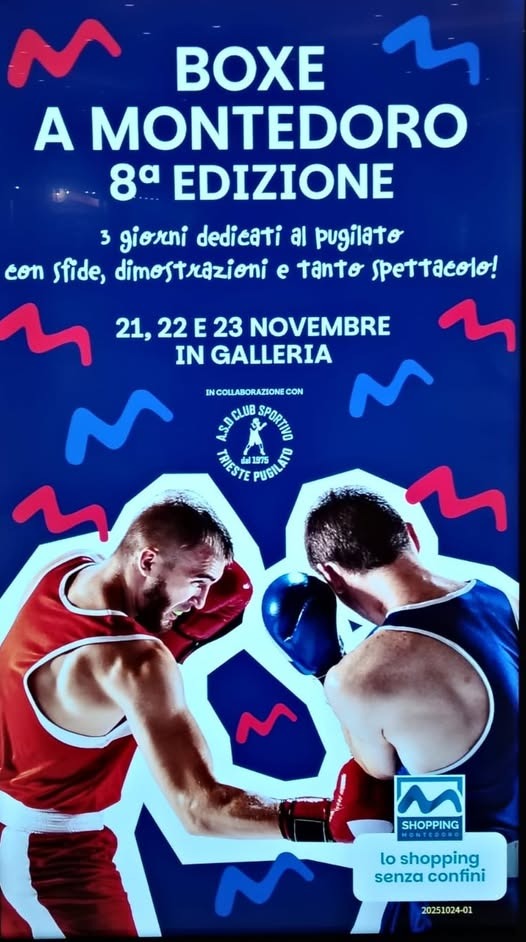 TRIESTE – È tutto pronto al Centro Commerciale Montedoro per l’ottava edizione di “Boxe a Montedoro”, l’appuntamento pugilistico organizzato dall’A.S.D. Club Sportivo Trieste Pugilato, che da venerdì 21 novembre a domenica 23 novembre porterà sul ring atleti di ogni età tra allenamenti, esibizioni e incontri ufficiali, con ingresso gratuito.