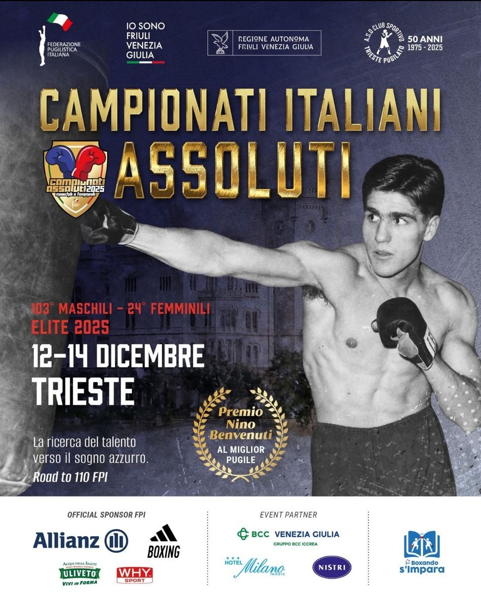 L’A.S.D. Club Sportivo Trieste Pugilato, sostenuta dal Comitato Regionale FPI del FVG, dalla Regione Friuli Venezia Giulia, da Io Sono FVG e dai partner dell’evento, ha già completato le fasi organizzative per i Campionati Italiani Assoluti Elite – giunti alla 103ª edizione maschile e alla 24ª femminile.