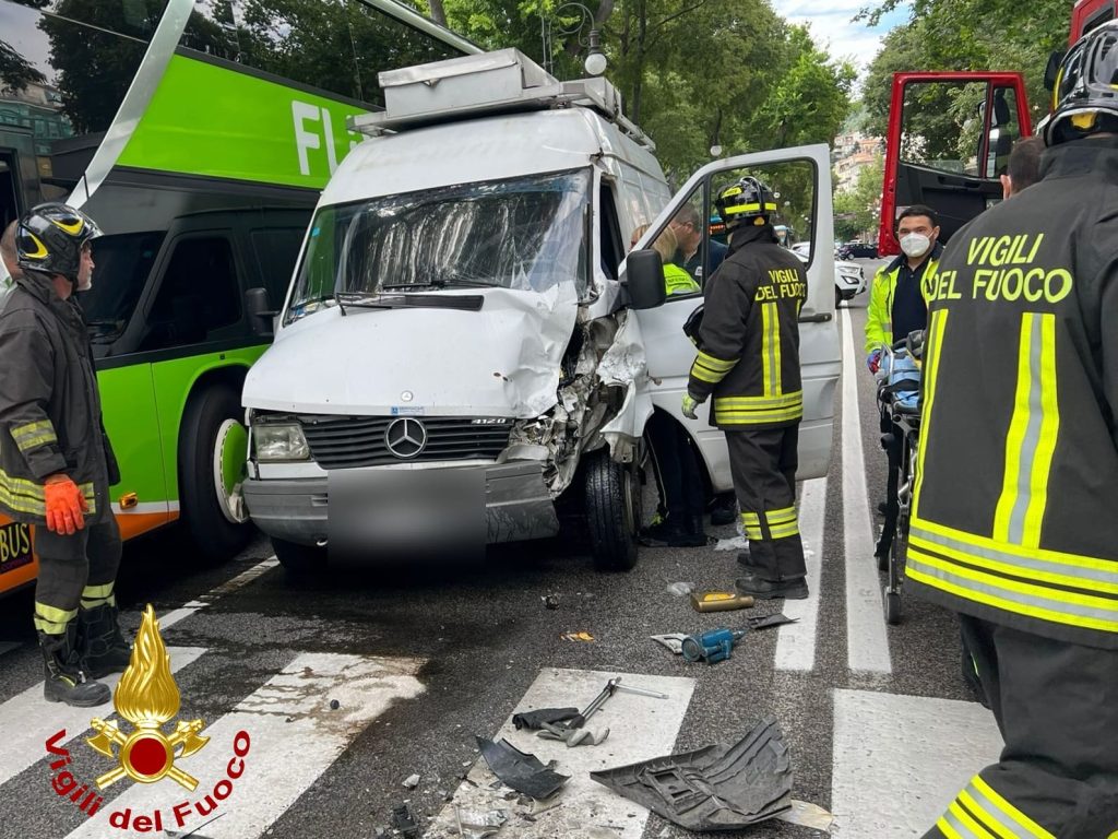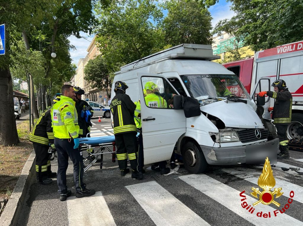 Trieste, violento scontro tra pullman e furgone: conducente incastrato, ferito