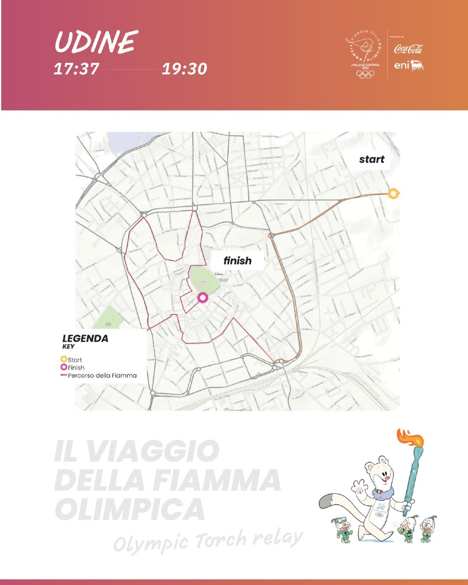 La fiamma olimpica partirà alle 17.37 circa da via Cividale, altezza supermercato Lidl, e percorrerà viale Trieste, piazzale D’Annunzio, via Aquileia in direzione centro, via Piave, via Gorghi, via Crispi, Piazza Garibaldi, via del Gelso, via Poscolle, via Marco Volpe, via Micesio sul ring urbano. Si dirigerà verso il centro storico attraverso via Anton Lazzaro Moro, via Mantica, e palazzo Antonini, arrivando poi in via Gemona e piazzale Osoppo. Da qui il corteo olimpico transiterà in viale della Vittoria verso piazza Primo Maggio. Arrivati in Giardin Grande il tedoforo svolterà in via Porta Nuova, passerà per piazzetta San Cristoforo, compiendo i suoi ultimi passi in via Mercatovecchio, piazza Matteotti, via Cavour e chiuderà il suo percorso in piazza Libertà. I metri finali fino alla tappa finale saranno trasmessi live nel villaggio allestito di fronte alla Loggia del Lionello. A gestire la viabilità e a occuparsi della sicurezza del percorso saranno gli agenti della Polizia Locale di Udine.
