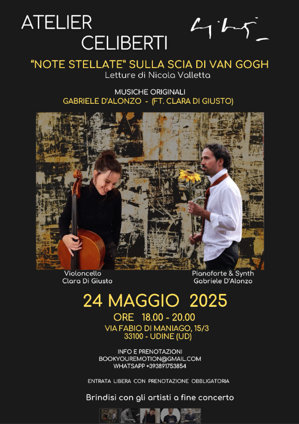 UDINE – Sabato 24 maggio 2025 alle ore 18.00, l’Atelier Celiberti in via Fabio di Maniago 15/3 ospiterà un evento musicale e culturale di grande fascino dal titolo “Note stellate”, dedicato alla figura di Vincent Van Gogh. Protagonista della serata sarà il pianista e compositore Gabriele D’Alonzo, accompagnato da ospiti di rilievo come la violoncellista Clara Di Giusto, il lettore Nicola Valletta e il critico musicale Ugo Falcone.