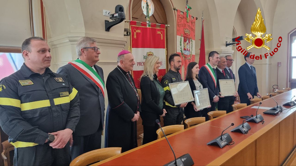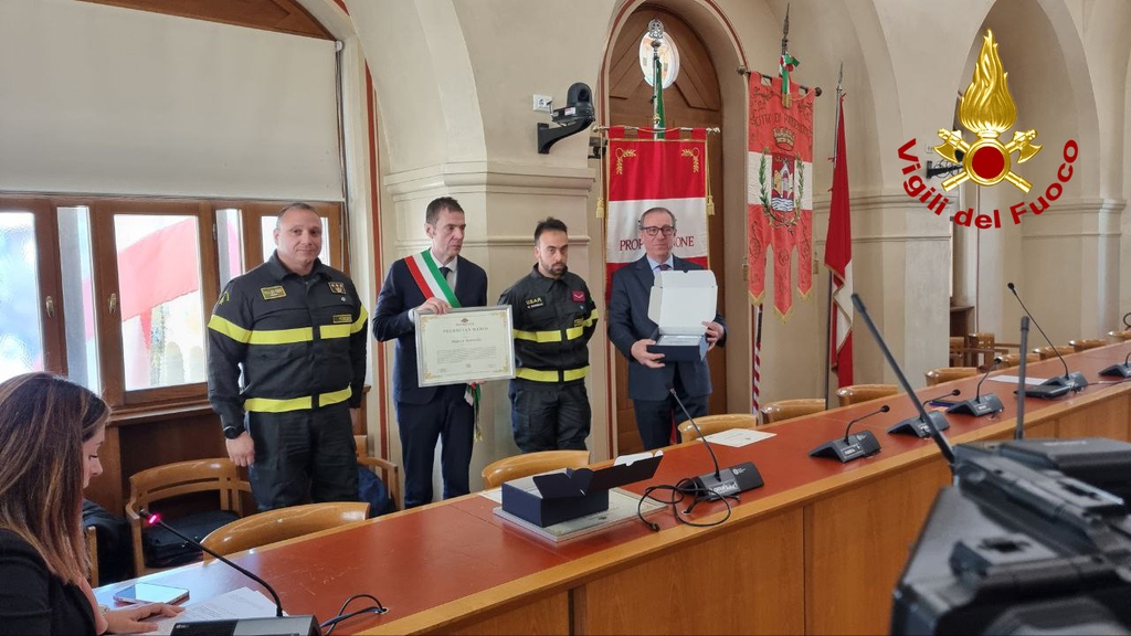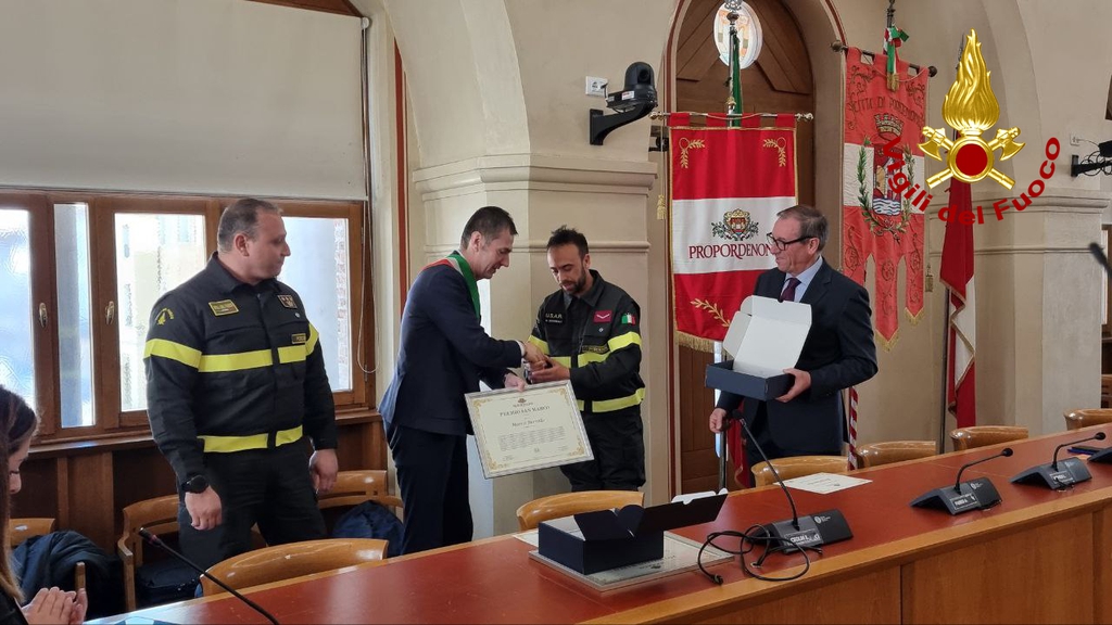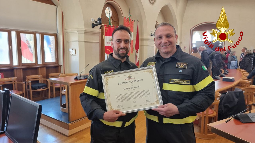 Nella Sala Consiliare del Comune di Pordenone, alla presenza delle autorità locali, il Sindaco di Pordenone e il Presidente dell’Associazione Propordenone Onlus hanno assegnato al Vigile del Fuoco Marco Borrello il PREMIO “SAN MARCO” 2024 con la seguente motivazione: “riconoscendo nella sua encomiabile attività professionale un esempio soprattutto per le giovani generazioni”. Assieme a Borrello era presente anche il comandante, Daniele Mercuri, in rappresentanza del comando.