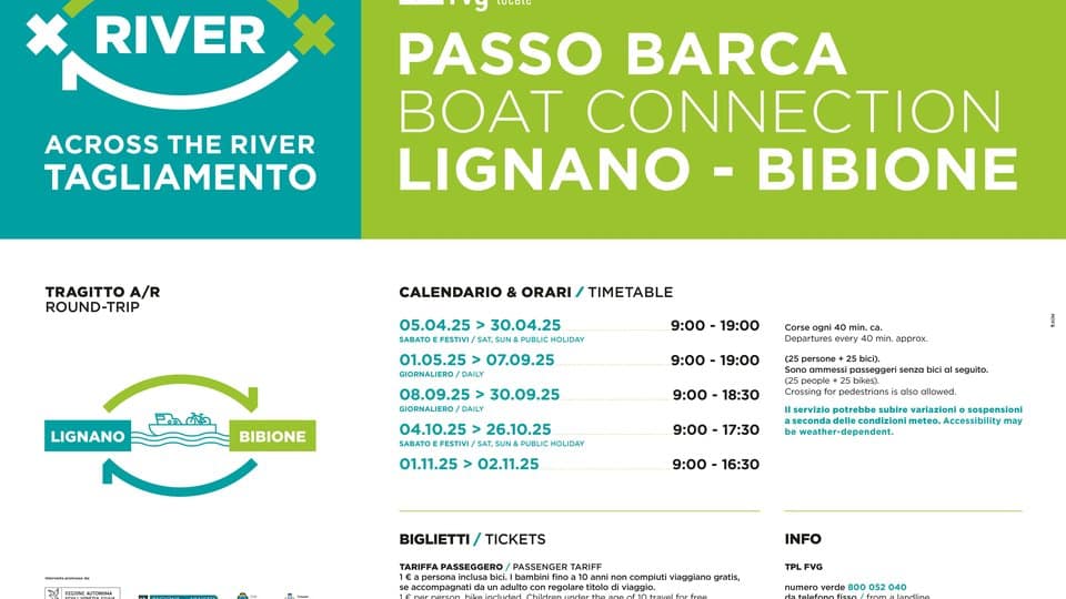 Il servizio è particolarmente vantaggioso per i turisti in bicicletta, grazie alla crescente rete di percorsi ciclabili che rende la zona di Lignano Sabbiadoro sempre più accessibile e adatta a un turismo ecologico e attento alla sostenibilità. Il collegamento permette così di esplorare l’intero territorio in modo pratico e divertente, contribuendo a favorire un turismo sostenibile, rispettoso dell’ambiente e della bellezza naturale del fiume Tagliamento.